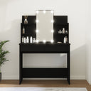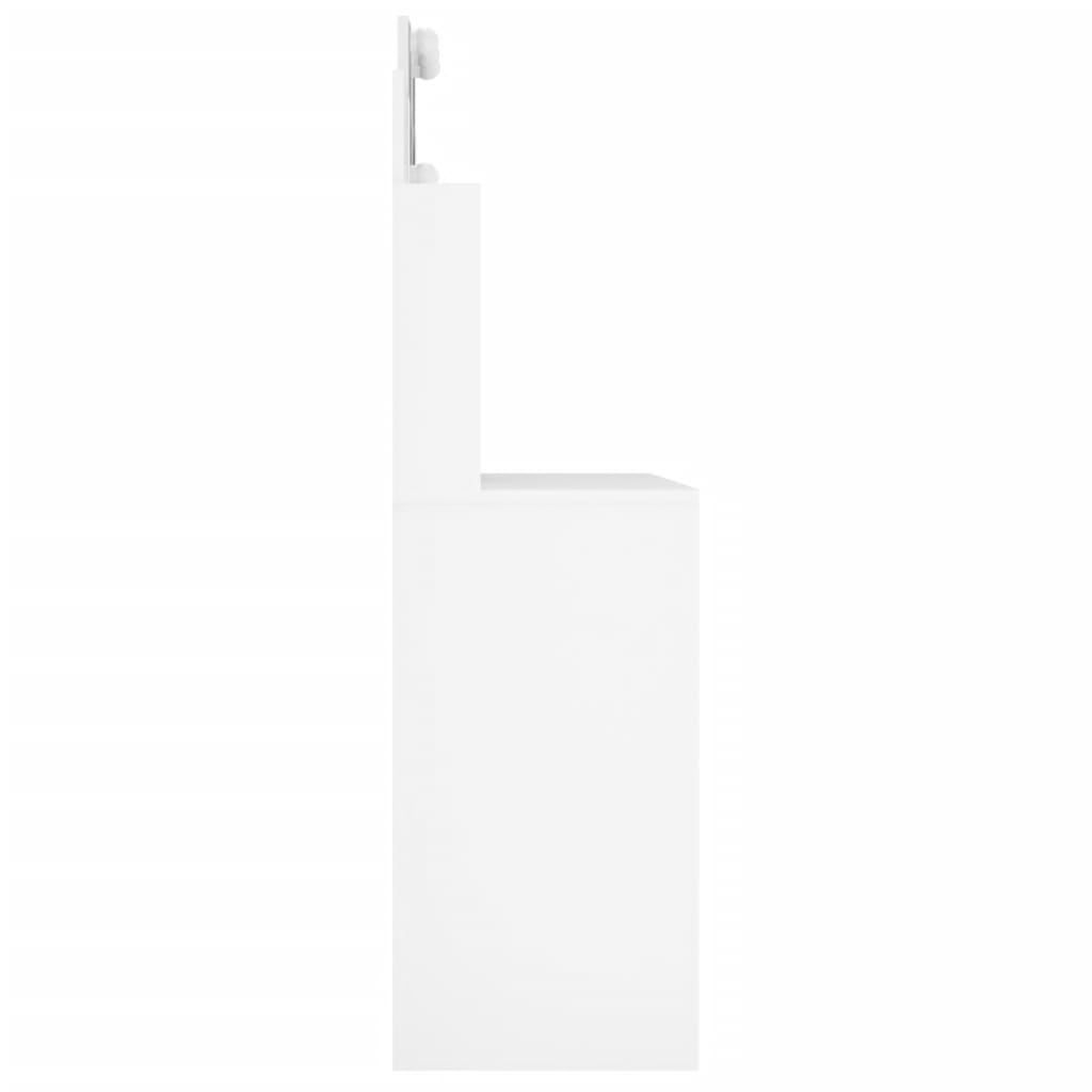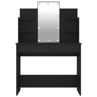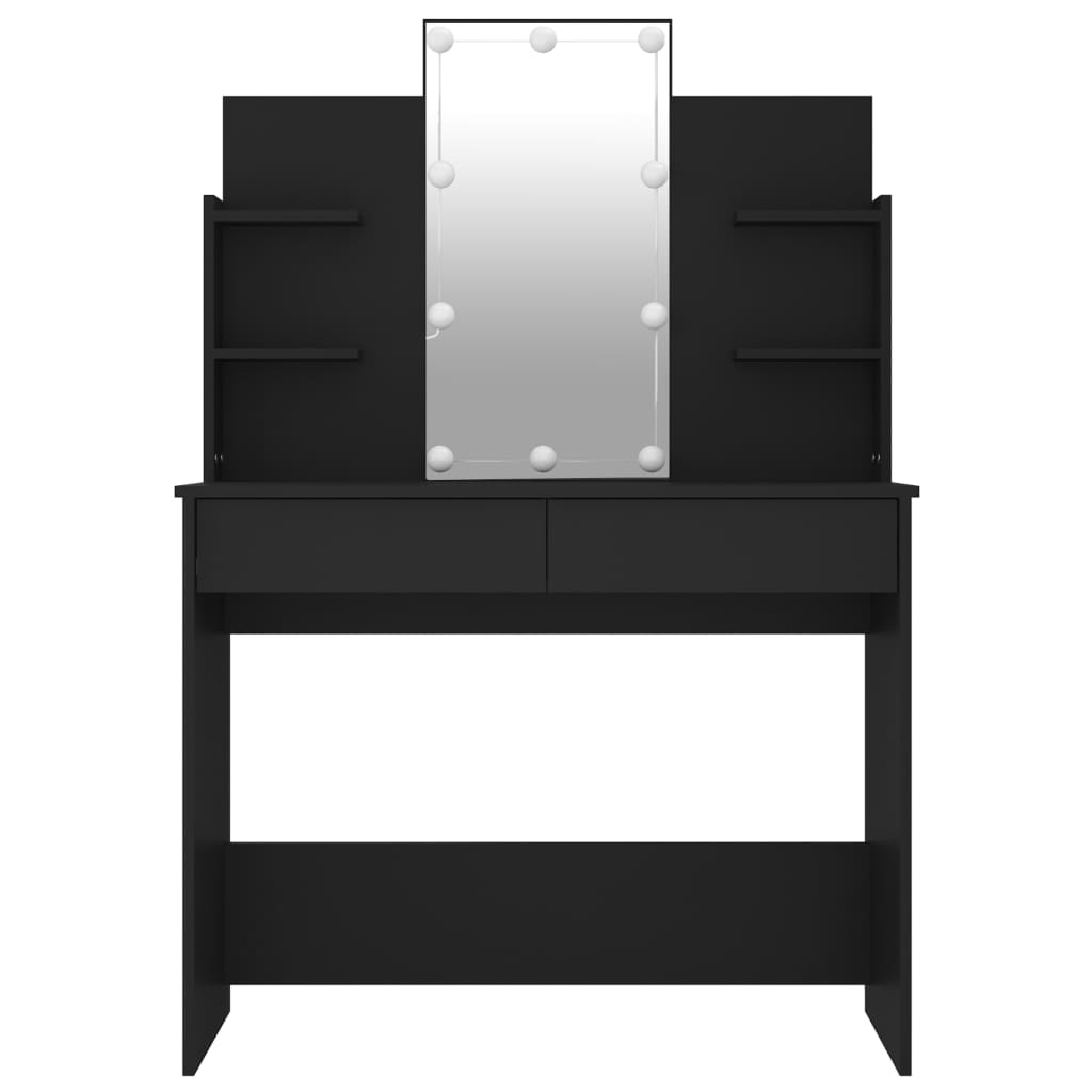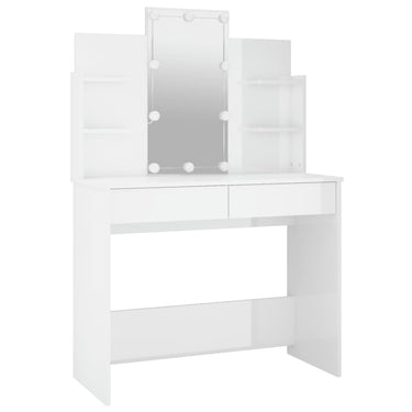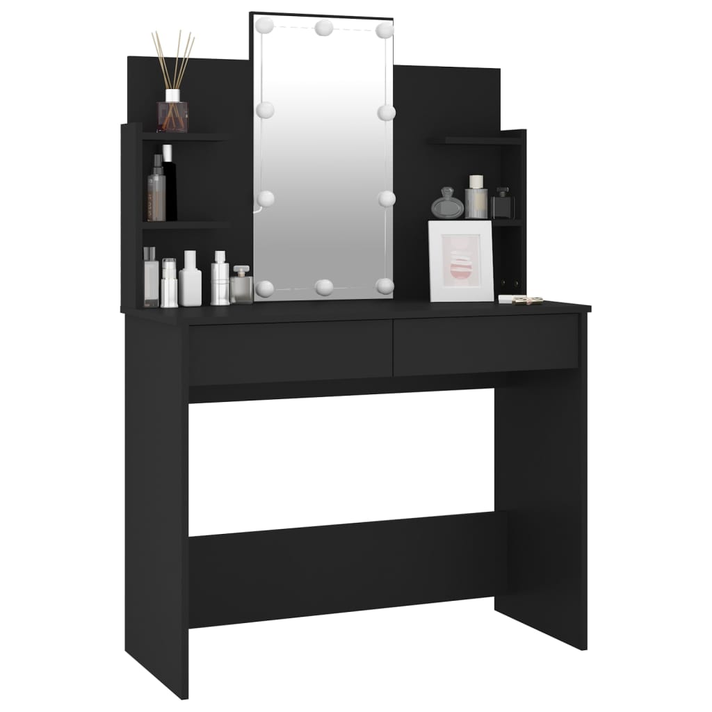 Dotée de lignes droites raffinées et d'une forme asymétrique soulignant un style unique, cette coiffeuse ne manquera pas de faire tourner les têtes ! Matériau durable : le bois d'ingénierie est d'une qualité exceptionnelle avec une surface lisse et présente également résistance, stabilité et résistance à l'humidité.Lumière LED : la table cosmétique dispose d'ampoules LED avec USB, qui sont faciles à changer de mode du blanc chaud au blanc froid. Les ampoules LED autour du miroir illuminent également votre beauté.Espace de rangement pratique : cette table de maquillage dispose également d'étagères ouvertes et de deux tiroirs, ce qui vous permet de ranger vos accessoires de maquillage et de garder tout à sa place. Attention :Afin d'éviter qu'il ne bascule, ce produit doit être utilisé avec le dispositif de fixation murale fourni.