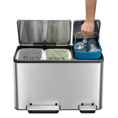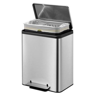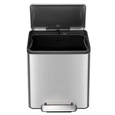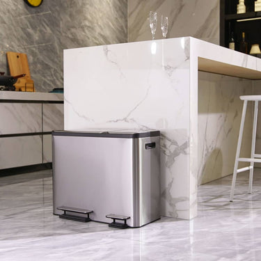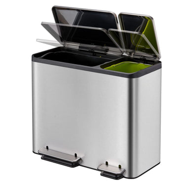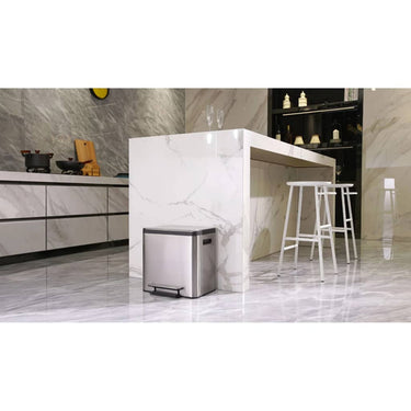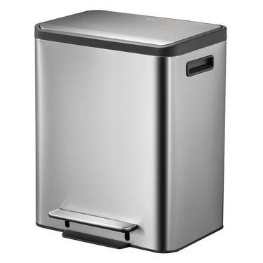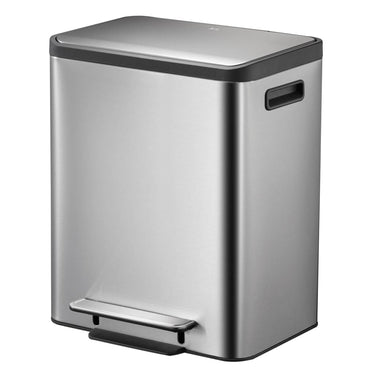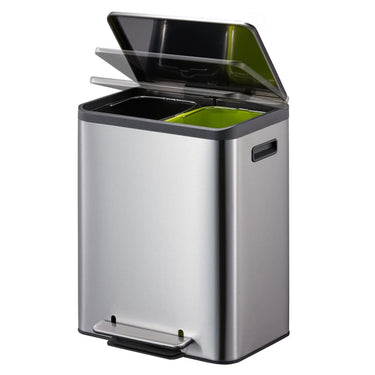 La poubelle argentée mate EcoCasa de 30 L de la marque EKO est une poubelle rectangulaire élégante en acier inoxydable brossé avec revêtement anti-empreintes digitales et poignées de couvercle en plastique. Elle est équipée d'un couvercle à fermeture en douceur et de deux seaux intérieurs en plastique de 15 L pour le tri des déchets. La fonction de maintien en position ouverte verrouille le couvercle pour faciliter le nettoyage de la poubelle ou le remplacement du sac à déchets. C'est une solution de confinement des déchets idéale pour toute cuisine moderne.