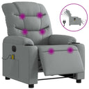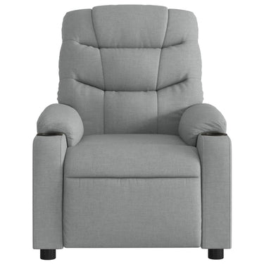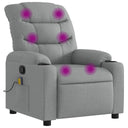 Asseyez-vous et détendez-vous dans ce fauteuil inclinable de massage très confortable ! Fonction d'inclinaison manuelle : ce fauteuil inclinable est doté d'une poignée du côté droit. Vous pouvez régler manuellement le repose-pieds et le dossier dans n'importe quelle position selon votre confort en tirant simplement sur la poignée. Cette fonction permet une inclinaison maximale de 135 degrés. De plus, le dossier peut revenir rapidement à sa position d'origine en tirant simplement sur la poignée.Fonction de vibration : les 6 points de massage vous permettent de faire l'expérience d'un massage mieux ciblé. De plus, la télécommande incluse vous permet de choisir différents programmes de massage. La fonction de massage est alimentée par le connecteur USB, mais la source d'alimentation USB 5V certifiée n'est pas incluse.Expérience d'assise confortable : le siège, le dossier et les larges accoudoirs bien rembourrés recouverts de tissu procurent une sensation confortable et chaleureuse, vous permettant de vous sentir enveloppé lorsque vous êtes assis. Le tissu présente un aspect simple et épuré et est respirant et durable.Porte-gobelets et poche latérale pratiques : ce fauteuil dispose de deux porte-gobelets pratiques pour vos boissons et d'une poche latérale pour votre télécommande ou pour garder vos objets essentiels à portée de main.Cadre solide et stable : le cadre en bois et en métal offre une structure solide et une grande stabilité. Ce fauteuil inclinable est confortable et durable.