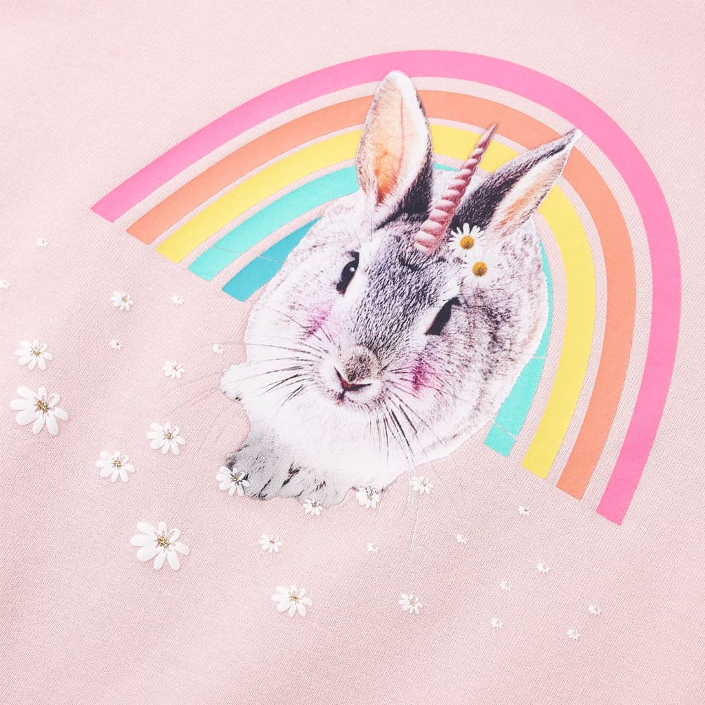 Deze trui voor kinderen heeft lange mouwen, een ronde hals en geribbelde randen aan de manchetten, halslijn en onderkant. Op de kindertrui staan een regenboog en een konijn afgebeeld. De kindertrui is gemaakt van katoen en elastaan, waardoor hij comfortabel en ademend is.
