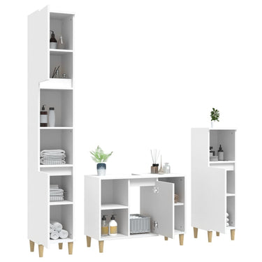 Cet ensemble de meubles de salle de bain, avec un espace de rangement spacieux, est un excellent supplément à votre salle de bain, ce qui lui donne une apparence ordonnée et saisissante ! Matériau durable : le bois d'ingénierie est d'une qualité exceptionnelle avec une surface lisse et présente également résistance, stabilité et résistance à l'humidité.Grand espace de rangement : ces armoires de salle de bain offrent un grand espace de rangement pour garder vos fournitures de salle de bain bien organisées.Pieds en bois : les pieds en bois d'eucalyptus massif donnent au meuble de salle de bain un aspect naturel et agréable tout en assurant la stabilité.Surface facile à nettoyer : l'ensemble de salle de bain est facile à nettoyer avec un chiffon humide.Design élégant : les lignes épurées et le design élégant se fondent parfaitement dans votre salle de bain. Attention :Pour éviter qu'il ne soit renversé, ce produit doit être utilisé avec le dispositif de fixation au mur fourni. Bon à savoir :Les vis et les chevilles pour l'intérieur du mur ne sont pas incluses. Nous vous conseillons de trouver et d'utiliser des vis et des chevilles adaptées spécifiquement à vos murs. Si vous n'êtes pas sûr, vous pouvez consulter un professionnel. Veuillez lire et suivre chaque étape des instructions.