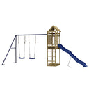 Vous voulez donner à vos enfants la liberté de jouer à la maison ? Cet ensemble de jeu d'extérieur en bois transforme votre jardin en un terrain de jeu propice aux aventures imaginatives ! Bois imprégné : ce cadre d'escalade est fabriqué en bois de pin imprégné sous vide. Le bois de pin massif est un matériau naturel magnifique. Le bois de pin a un grain droit et les nœuds lui confèrent un aspect rustique caractéristique. L'imprégnation est un processus de conservation réalisé à l'aide d'autoclaves. Le traitement sous pression augmente la résistance à la pourriture et aux intempéries.Cadre robuste et stable : le cadre en bois de l'ensemble de jeu assure la robustesse et la stabilité. De plus, les pieds en forme de A de la balançoire pour enfants permettent de garder l'équilibre.Centres multi-activités : l'aire de jeux est dotée d'une plate-forme de 118 cm de hauteur et se distingue par son toboggan ondulé, une balançoire double ainsi qu'un bac à sable. Vos enfants peuvent également inviter leurs amis à jouer ensemble.Conception réfléchie : les garde-corps en bois qui entourent l'abri sont conçus pour assurer la sécurité des enfants pendant qu'ils s'amusent. De plus, le toit en bois offre de l'ombre à vos enfants pendant les chaudes journées d'été.Plaisir sans fin : cette maisonnette de jeu en bois est le moyen idéal pour vos enfants et leurs amis de se divertir, d'avoir plus de temps interactif et de créer des souvenirs pour vous et vos enfants ! Attention :Uniquement pour un usage domestiqueUtilisation extérieureNe convient pas aux enfants de moins de 3 ansÂge recommandé : 3-8 ans Remarque :Le produit doit être ancré afin de réduire les risques de basculement. Les ancres sont incluses.