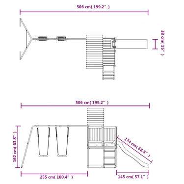Vous voulez donner à vos enfants la liberté de jouer à la maison ? Cet ensemble de jeu d'extérieur en bois transforme votre jardin en un terrain de jeu propice aux aventures imaginatives ! Matériau durable : ce cadre d'escalade de jardin est fabriqué en bois de pin massif. Le pin massif est un matériau naturel magnifique. Le bois de pin a un grain droit et les nœuds lui confèrent son aspect rustique caractéristique.Cadre robuste et stable : le cadre en bois du cadre de jeu de jardin assure la robustesse et la stabilité. De plus, les pieds en forme de A de la balançoire pour enfants permettent de garder l'équilibre.Centres multi-activités : le cadre d'escalade est doté d'une plate-forme de 90 cm de hauteur et se distingue par son toboggan ondulé, une balançoire double et un bac à sable. Vos enfants peuvent également inviter leurs amis à s'amuser.Conception réfléchie : les balustrades en bois entourant sont conçues pour assurer la sécurité des enfants pendant qu'ils s'amusent. De plus, le toit en bois offre de l'ombre à vos enfants pendant les chaudes journées d'été.Plaisir sans fin : cette maisonnette de jeu extérieure en bois est le moyen idéal pour vos enfants et leurs amis de se divertir, d'avoir plus de temps interactif et de créer des souvenirs pour vous et vos enfants ! Attention :Uniquement pour un usage domestiqueUtilisation extérieure Ne convient pas aux enfants de moins de 3 ans Âge recommandé : 3-8 ans Remarque :Le produit doit être ancré afin de réduire les risques de basculement. Les ancrages ne sont pas inclus. Bon à savoir :Pour faciliter au maximum le montage, chaque produit est livré avec des instructions.