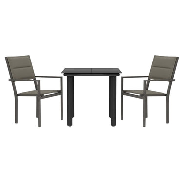 Profitez d'un bon repas ou d'un thé l'après-midi dans votre espace extérieur avec cet ensemble de salle à manger de jardin ! Ayant un design élégant, il deviendra le point central de votre jardin et de votre terrasse ! Cadre stable : les fauteuils et la table ont une construction en acier revêtu de poudre, ce qui les rend robustes et stables.Matériau durable : grâce au tissu textilène résistant avec rembourrage, ces chaises d'extérieur sont très confortables, résistantes aux intempéries et faciles à nettoyer.Dessus de table robustes : le dessus de table est en verre trempé, ce qui le rend facile à nettoyer. De plus, le dessus de table est parfait pour placer des collations, des boissons, des vases, des bols de fruits ou d'autres objets décoratifs.Expérience d'assise confortable : le dossier et les accoudoirs ergonomiques vous offrent une meilleure expérience d'assise. Bon à savoir :Pour que vos meubles d'extérieur restent beaux, nous vous recommandons de les protéger avec une housse imperméable.