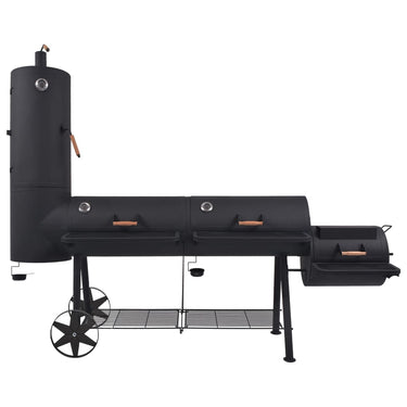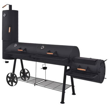 Ce fumoir déporté de haute qualité, composé 2 chambres de cuisson généreuses et d'un foyer latéral robuste, vous permet de griller et de fumer facilement de délicieuses viandes, poissons et légumes. Le corps métallique épais et parfaitement scellé est lourd et confère ainsi à notre fumoir d'excellentes caractéristiques de rétention de chaleur et de distribution de la chaleur. Vous pouvez surveiller la température dans les chambres avec les thermomètres intégrés. Le fumeur dispose également d'une étagère à l'avant du foyer et d'une grande étagère sous les chambres de cuisson sur laquelle vous pouvez placer des épices, des ingrédients, des ustensiles et d'autres éléments essentiels du barbecue. Grâce aux poignées en bois, l'ouverture des chambres est sûre et pratique. Le fumeur de grande taille est équipé de 2 roues, ce qui lui permet de se déplacer facilement pour les fêtes en plein air, les pique-niques et les rassemblements.