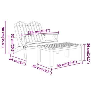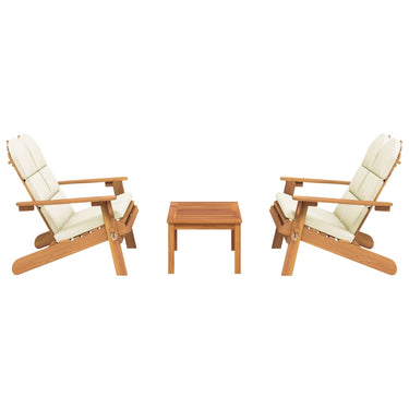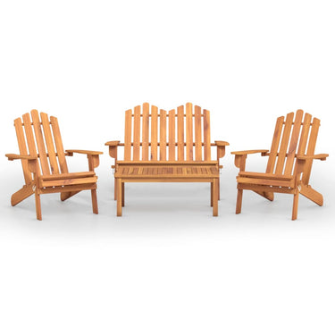 Profitez de votre temps libre avec ce salon de jardin en bois de style Adirondack. Bois d'acacia massif : cet ensemble de salon est fabriqué en bois d'acacia massif. Le bois d'acacia massif est un matériau naturel magnifique. Le bois d'acacia est un bois dur tropical, qui est dense, robuste et durable.Expérience d'assise confortable : le dossier haut légèrement incliné et les accoudoirs larges vous permettent de vous asseoir confortablement tout en vous relaxant. Les coussins du dossier et de l'assise ajoutent également un confort supplémentaire.Table pratique : la table basse est parfaite pour placer vos boissons, aliments et autres objets de décoration.Design pliable : la chaise et le banc Adirondack peut être facilement plié lorsqu'il n'est pas utilisé, pour un rangement et un transport faciles. Bon à savoir :Pour faciliter au maximum le montage, chaque produit est livré avec des instructions. Remarque :Pour que vos meubles d'extérieur restent beaux, nous vous recommandons de les protéger avec une housse imperméable.