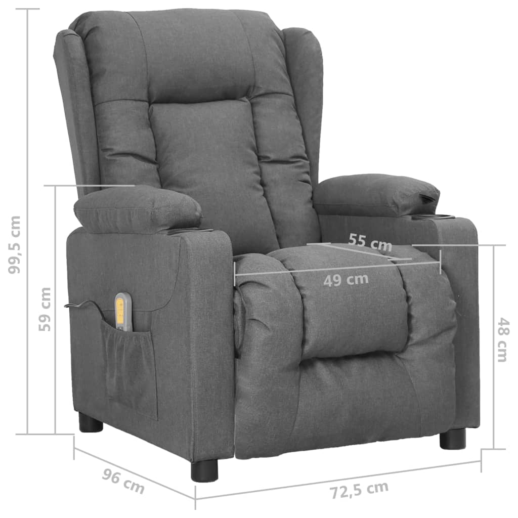 Asseyez-vous et détendez-vous dans ce fauteuil de massage très confortable ! Fonction d'inclinaison manuelle : le fauteuil inclinable est spécialement conçu avec 3 positions d'inclinaison afin que vous puissiez régler manuellement le dossier et le repose-pieds selon votre confort.Fonction de levage électrique : ce fauteuil inclinable pour personnes âgées est équipé d'un moteur électrique pour la fonction de levage. Grâce à la fonction qui pousse toute la chaise vers le haut, vous pouvez facilement vous tenir debout sans stresser votre dos et vos genoux grâce à la commande manuelle à 2 boutons.Fonction de vibration : les 6 points de massage proposés te permettent de bénéficier d'un massage mieux ciblé. De plus, la commande manuelle incluse te permet de choisir différents programmes de massage. La fonction de massage est alimentée par le connecteur USB, mais la source d'alimentation USB 5 V certifiée n'est pas incluse. Grâce à la fonction de chauffage, il soulage la tension de la taille et favorise la circulation sanguine.Expérience d'assise confortable : le siège, le dossier et les larges accoudoirs rembourrés épais recouverts de tissu procurent une sensation confortable et chaleureuse, vous permettant de vous sentir enveloppé lorsque vous êtes assis. Le tissu présente un aspect simple et épuré, et est respirant et durable.Cadre solide et stable : le cadre en bois et en métal offre une structure solide et une grande stabilité. Ce fauteuil inclinable est confortable et durable.