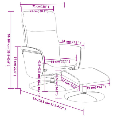 Vous cherchez un fauteuil pour vous reposer complètement après une journée bien remplie ? Ce fauteuil inclinable confortable est un choix parfait ! Fonction d'inclinaison manuelle : ce fauteuil inclinable est spécialement conçu avec une fonction d'inclinaison afin que vous puissiez régler le dossier selon votre confort. Le dossier peut être incliné de 105 à 125 degrés.Pivotement à 360 degrés : le fauteuil peut pivoter librement à 360 degrés, ce qui lui confère une flexibilité supplémentaire.Expérience d'assise confortable : le siège, le dossier et les accoudoirs rembourrés épais recouverts de similicuir procurent une sensation confortable et chaleureuse, vous faisant vous sentir enlacé lorsque vous êtes assis. Le tabouret supplémentaire permet de reposer les pieds lorsque l'on s'allonge sur le fauteuil, ce qui fait de ce fauteuil un siège confortable en toute occasion.Cadre solide et stable : le cadre en contreplaqué et en métal offre une structure solide et une stabilité. Ce fauteuil inclinable est confortable et durable. Bon à savoir :Pour gagner de la place, certaines pièces ou coussins sont rangés à l'intérieur des meubles. Vérifiez les compartiments zippés ou sous la housse du siège pour détecter d'éventuels éléments cachés.