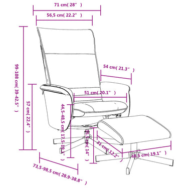 Vous cherchez un fauteuil pour vous reposer complètement après une journée bien remplie ? Ce fauteuil inclinable confortable est un choix parfait ! Fonction d'inclinaison manuelle : ce fauteuil inclinable est spécialement conçu avec une fonction d'inclinaison afin que vous puissiez régler le dossier selon votre confort. Le dossier peut être incliné de 105 à 125 degrés.Pivotement à 360 degrés : le fauteuil peut pivoter librement à 360 degrés, ce qui lui confère une flexibilité supplémentaire.Expérience d'assise confortable : le siège, le dossier et les accoudoirs rembourrés épais recouverts de similicuir procurent une sensation confortable et chaleureuse, vous faisant vous sentir enlacé lorsque vous êtes assis. Le tabouret supplémentaire permet de reposer les pieds lorsque l'on s'allonge sur le fauteuil, ce qui fait de ce fauteuil un siège confortable en toute occasion.Cadre solide et stable : le cadre en contreplaqué et en métal offre une structure solide et une stabilité. Ce fauteuil inclinable est confortable et durable.