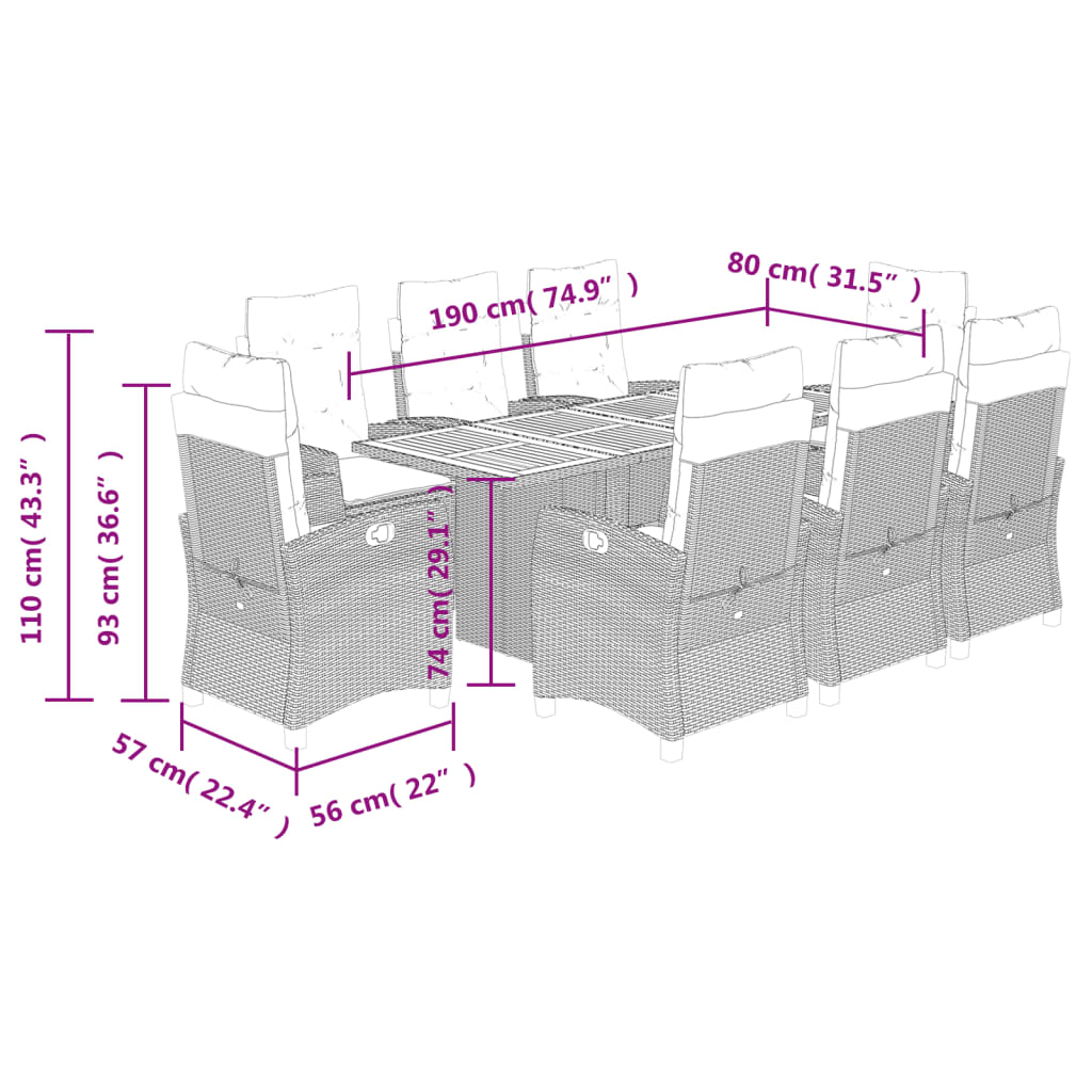 Ensemble à manger de jardin 9pcs coussins noir résine tressée