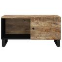 Vous cherchez une table basse pour vos loisirs ? Ne cherchez que cette table basse en bois, qui donne une expérience visuelle unique à l'espace. Bois de manguier massif : cette table d'appoint est fabriquée en bois de manguier massif, un bois dur aux grains denses. Le bois de manguier massif a non seulement la force de supporter le poids, mais résiste également à l'usure du temps.Rangement spacieux : ce bout de canapé comprend 2 compartiments, offrant un grand espace de rangement pour garder vos articles essentiels organisés et à portée de main.Dessus de table robuste : le dessus de la table de salon offre une surface sécurisée pour placer des collations, des boissons, des vases, des bols de fruits ou d'autres articles décoratifs.Porte pratique : gardez vos essentiels à l'abri de la poussière en les cachant derrière la porte de ce bout de canapé. Remarque :Chaque produit est livré avec un manuel de montage dans la boîte pour un montage facile.Les couleurs peuvent varier d'une pièce à l'autre, rendant chaque pièce unique et légèrement différente l'une de l'autre. La livraison est aléatoire, ce qui garantit l'exclusivité et l'individualité de votre produit.
