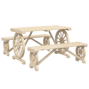 Profitez d'un bon repas ou d'un thé l'après-midi dans votre espace extérieur avec cet ensemble à manger de jardin en bois ! Bois de sapin massif : le bois de sapin massif est un matériau beau et durable qui conserve son intégrité même lorsqu'il est exposé à l'humidité. Il ne sèche pas et ne se déforme pas, ce qui en fait un choix fiable.Table pratique : la table de jardin est parfaite pour placer vos boissons, aliments et autres objets de décoration.Design attrayant : l’ensemble à manger d’extérieur présente un design en forme de roue de chariot qui offre un affichage accrocheur sous tous les angles. Bon à savoir :Pour que vos meubles d'extérieur restent beaux, nous vous recommandons de les protéger avec une housse imperméable.