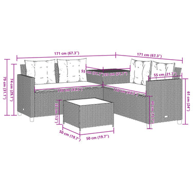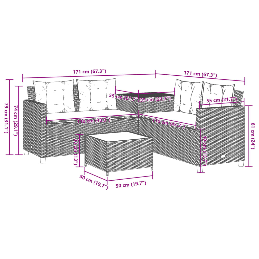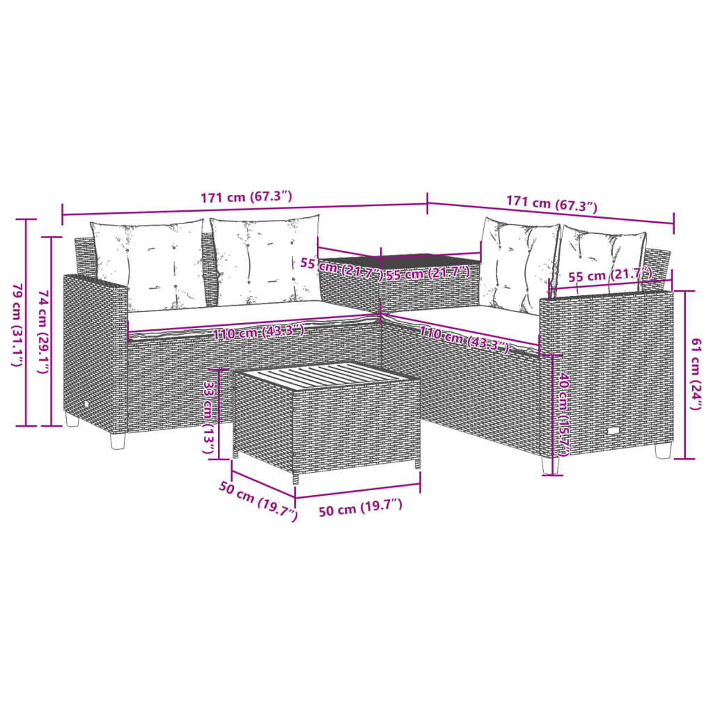 Ce canapé de jardin en forme de L est le complément parfait de votre jardin, terrasse ou patio, offrant un espace confortable et accueillant pour discuter avec la famille et les amis ou simplement se détendre et profiter de l'extérieur. Matériau durable : la résine tressée, également connue sous le nom de poly rotin, est un matériau synthétique solide et nécessitant peu d'entretien qui ressemble au rotin naturel. Elle est légère, facile à nettoyer et couramment utilisée pour les meubles d'extérieur en raison de sa durabilité et de ses propriétés de résistance aux intempéries.Fonction de rangement avec sac résistant à l'eau : la table d'appoint de jardin dispose d'un espace de rangement en dessous, complété par un sac résistant à l'eau pour ranger les coussins, les jouets et d'autres objets. Les sacs intérieurs sont dotés d'un couvercle et peuvent être solidement fixés aux sièges à l'aide de bandes auto-agrippantes pour plus de stabilité.Expérience d'assise confortable : ce mobilier d'extérieur, doté de coussins épais, offre une expérience d'assise confortable.Housse amovible et lavable : ces coussins de siège sont dotés de housses amovibles pour un lavage et un entretien faciles.Dessus en verre : le dessus de la table d'extérieur est fabriqué en verre trempé solide et durable, ce qui le rend facile à nettoyer avec un chiffon humide et ajoute une touche d'élégance à votre espace extérieur. Bon à savoir :Pour que vos meubles d'extérieur restent beaux, nous vous recommandons de les protéger avec une housse imperméable.