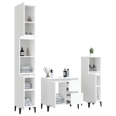 Cet ensemble d'armoires de salle de bain attrayant, avec un grand espace de rangement, présente un design élégant mais pratique. Matériau durable : le bois d'ingénierie est d'une qualité exceptionnelle avec une surface lisse et présente également résistance, stabilité et résistance à l'humidité. Grand espace de rangement : l'espace de rangement facilite l'organisation des articles dans ces meubles de salle de bain. Pieds en métal : les pieds en métal ajoutent un style moderne et calme à votre intérieur tout en assurant la stabilité.Surface facile à nettoyer : l'ensemble de salle de bain est facile à nettoyer avec un chiffon humide.Design élégant : les lignes épurées et le design élégant se fondent parfaitement dans votre salle de bain. Attention :Pour éviter qu'il ne soit renversé, ce produit doit être utilisé avec le dispositif de fixation au mur fourni. Bon à savoir :Les vis et les chevilles pour l'intérieur du mur ne sont pas incluses. Nous vous conseillons de trouver et d'utiliser des vis et des chevilles adaptées spécifiquement à vos murs. Si vous n'êtes pas sûr, vous pouvez consulter un professionnel. Veuillez lire et suivre chaque étape des instructions.