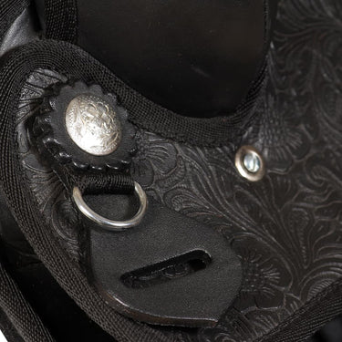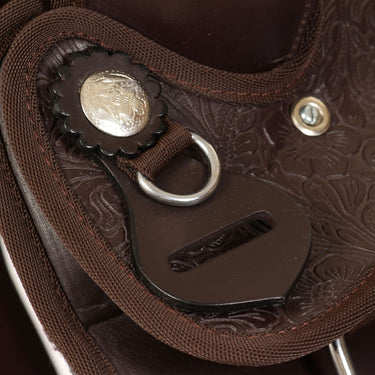 Cette selle western est livrée avec un bridon assorti et un col de poitrine. Le cuir véritable de haute qualité et le cuir synthétique qui est décoré avec gaufrage floral font la selle décorative ainsi que fonctionnelle. La selle western est renforcée à tous les points de pression pour une durabilité accrue. Les étriers en cuir sont robustes et solides, tout comme la billette et la sangle. Cette selle est très confortable pour que le cheval et le cavalier puissent passer de longues heures sur la piste.