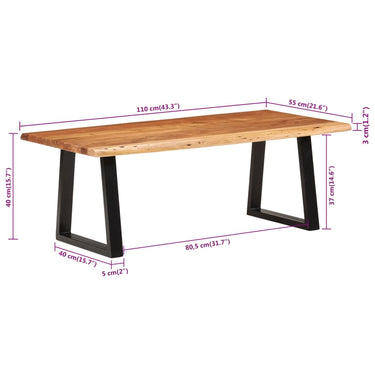 Ajoutez une touche d'élégance à votre salon avec cette élégante table basse. Bois d'acacia massif : le bois d'acacia massif est un matériau naturel magnifique. Le bois d'acacia un bois dur tropical, qui est dense, robuste et durable.Bord vivant : le bord vivant du bois qui suit la forme naturelle de l'arbre augmente la beauté de la table centrale.Dessus de table robuste : le dessus de table robuste de la table de salon est parfait pour placer des boissons, des aliments et d'autres objets décoratifs.Pieds robustes : es pieds en fer enduit de poudre ajoutent à la robustesse et à la stabilité de la table basse. Bon à savoir :Chaque article est unique, avec des variations de couleurs et de grains. La livraison est aléatoire, ce qui garantit l'exclusivité et l'individualité de votre produit.
