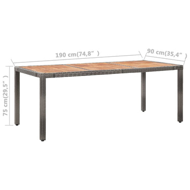 - Materiaal: PE rattan, acaciahouten tafelblad en armsteunen, en gepoedercoat stalen frame
