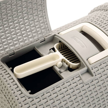 Deze kattenbak is gemaakt van zeer sterk, hoogwaardig kunststof rotan. Hij heeft een handige lade, waardoor het makkelijk is om de kattenbak te verschonen en om te controleren of hij verschoont moet worden. De lade is uitgerust met een blad met gaten erin, om uitwerpselen uit de bak te houden en deze langer fris te houden. Deze kattenbak combineert een stijlvol ontwerp met praktische functies en zal goed staan in elk interieur.
