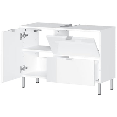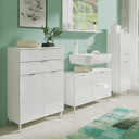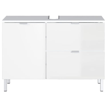 Deze wastafelkast van GW-Mauresa heeft prachtige witte hoogglans fronten. Hij is goed te combineren met andere meubelen van Germania.
