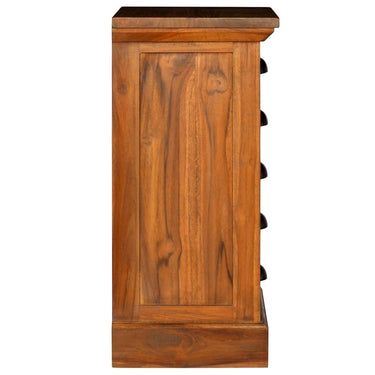 Deze charmante kast, gemaakt van massief teakhout, is een ruimtebesparend, rechthoekig meubel. De natuurlijke olieafwerking en het polijsten zorgen voor een glad en stofbestendig oppervlak dat gemakkelijk schoon te maken is met een vochtige doek. De 5 lades bieden een goede plek om kleine dagelijkse benodigdheden in op te bergen en houden je woonkamer of gang opgeruimd. De kast kan ook worden gebruikt als dressoir of kledingkast om ondergoed, pyjama's, sieraden en sokken in op te bergen.
