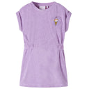 Deze kinderjurk heeft een ronde halslijn, korte mouwen met ingenaaide omgeslagen randen en een tailleband met trekkoord. Op deze kinderjurk staat op de borst een ijsje geborduurd. Het korte kinderjurkje is gemaakt van zacht materiaal met 75% katoen en 25% polyester, waardoor het comfortabel en ademend is.