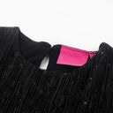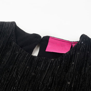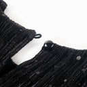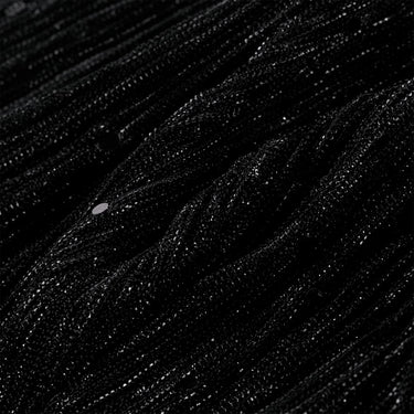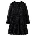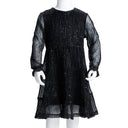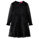 Deze kinderjurk heeft lange mouwen, een ronde halslijn en een sleutelgatopening met een knoop achterin de nek. Deze zwarte kinderjurk van wijduitlopende tule heeft een ontwerp met pailletten. De korte kinderjurk is gemaakt van zacht materiaal met een voering van katoen en een buitenkant van polyester, waardoor hij comfortabel en ademend is.
