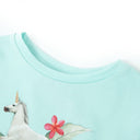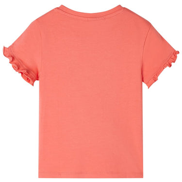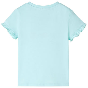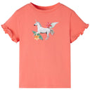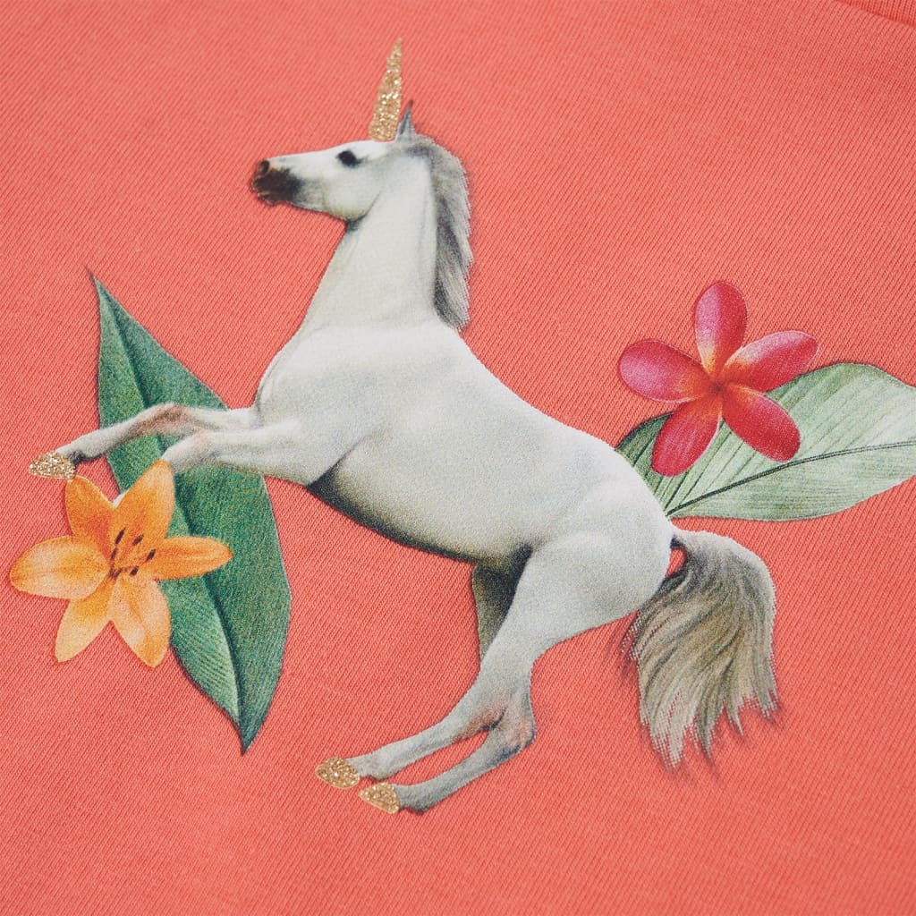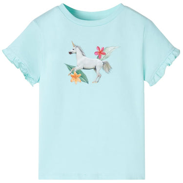 Dit kindershirt heeft korte mouwen met ruches, een ronde halslijn en een recht model. Op dit kindershirt staat een mooie eenhoorn met bladeren en bloemen afgebeeld. Het kindershirt met korte mouwen is gemaakt van zacht materiaal met 95% katoen en 5% elastaan, waardoor het comfortabel en ademend is.