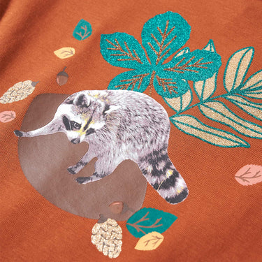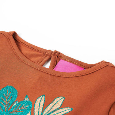 Dit t-shirt heeft lange mouwen, een ronde halslijn en een sleutelgat opening met een knoop achterin de nek. Op dit cognackleurige kindershirt staat een leuk diertje en geborduurde gevallen blaadjes afgebeeld. Het kindershirt met lange mouwen is gemaakt van zacht materiaal met 95% katoen en 5% elastaan voor extra comfort en ademend vermogen.