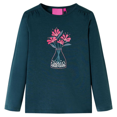 Dit kindershirt heeft lange mouwen, een ronde halslijn en een recht model. Op dit donkergroene kindershirt staan prachtige bloemen afgebeeld. Het kindershirt met lange mouwen is gemaakt van zacht materiaal met 95% katoen en 5% elastaan voor extra comfort en ademend vermogen.