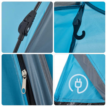- Snelspansysteem: zet de tent moeiteloos op met het snelspansysteem! Leg de tent op de grond, schuif de voorgemonteerde stokken uit tot ze vastklikken en je bent klaar!