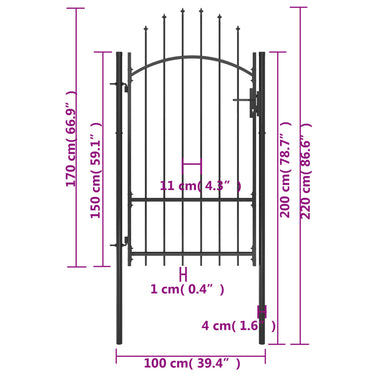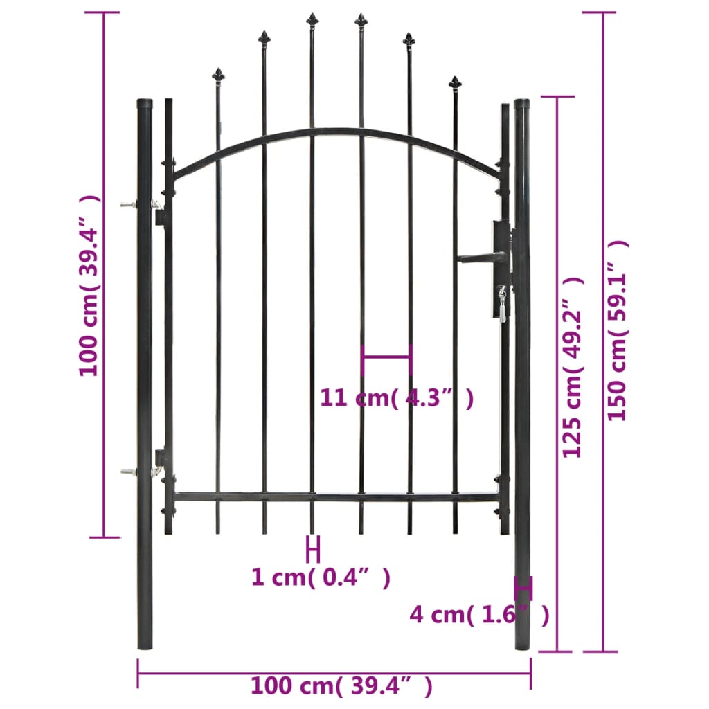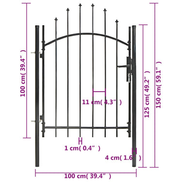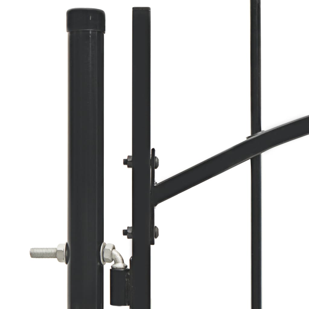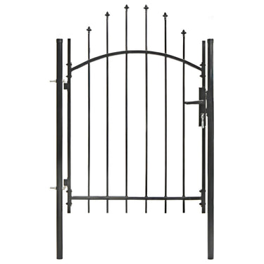 Dankzij het elegante ontwerp met gewelfde bovenkant en sterke horizontale beugels om het frame te versterken, zorgt onze poort voor een hoge mate van veiligheid en vormt hij een fantastische ingang naar je eigendom. De poort is vervaardigd van robuust staal en is gepoedercoat tegen roest en corrosie. Bovendien is hij uitgerust met een vergrendelingssysteem en wordt hij geleverd met twee stevige palen en stevige scharnieren voor eenvoudige installatie.