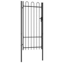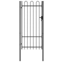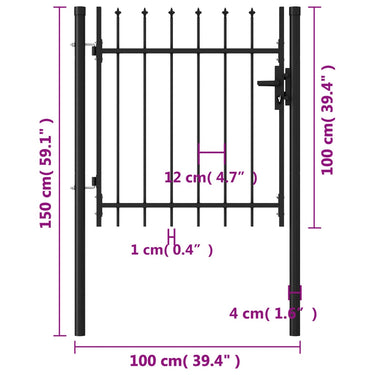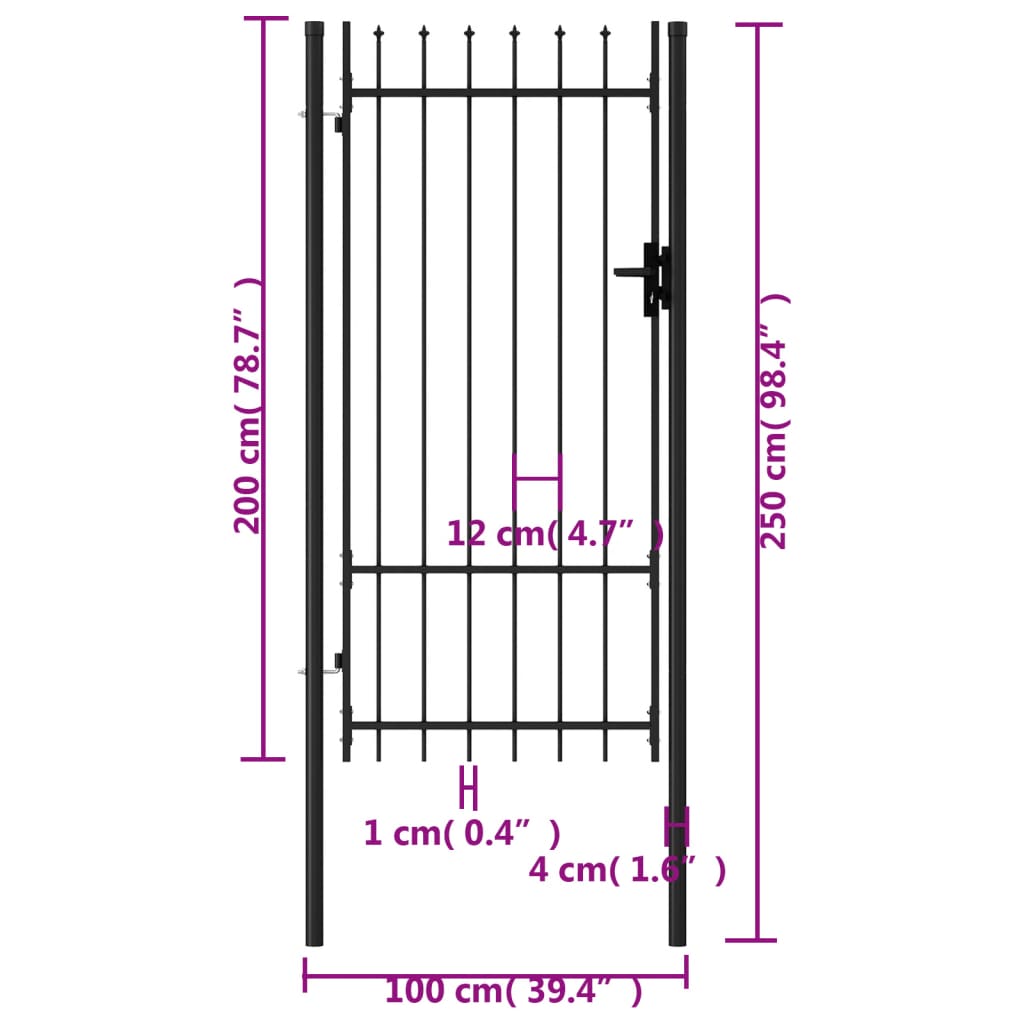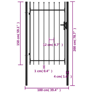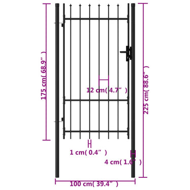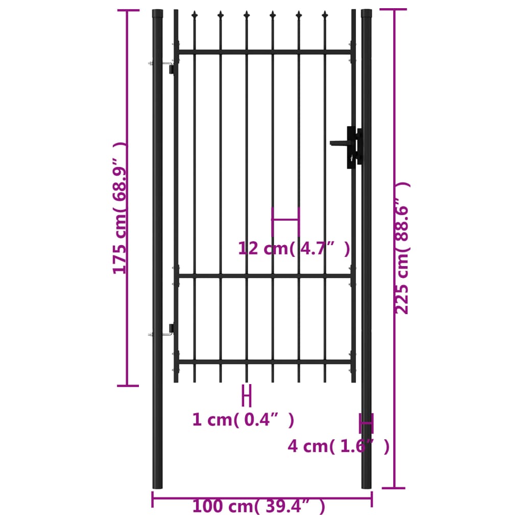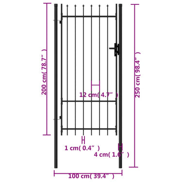 De verticale staven zijn voorzien van gebogen punten en het sterke horizontale frame biedt extra stevigheid. Onze tuinpoort zorgt voor een hoge mate van privacy en veiligheid terwijl hij ook een stijlvolle ingang tot je terrein is. De poort is gemaakt van stevig staal en is gepoedercoat om hem te beschermen tegen roest en corrosie.