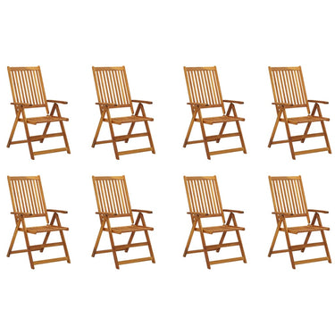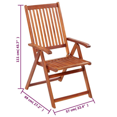 De eettafelset is gemaakt van hoogwaardig acaciahout, een tropisch hardhout. Dit acaciahout is waterbestendig en gaat vele jaren mee. De olie afwerking is makkelijk schoon te maken met een vochtige doek. De stoel is verstelbaar; de keuze uit 5 posities zorgt voor optimaal zitcomfort. De stoelen zijn ook inklapbaar, zo kan je ze eenvoudig opbergen.